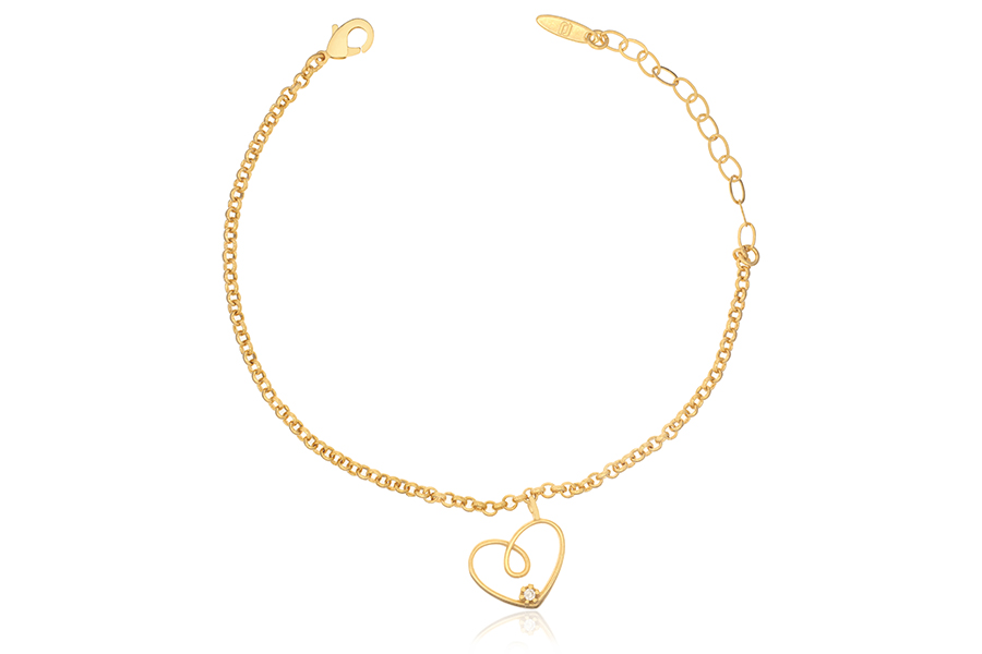 PULSEIRA BANHADA EM OURO, ELO PORTUGUÊS 3mm, ELO CORAÇÃO 4,20mm LARGURA, PINGENTE CORAÇÃO 11mm LARGURA COM MENINA