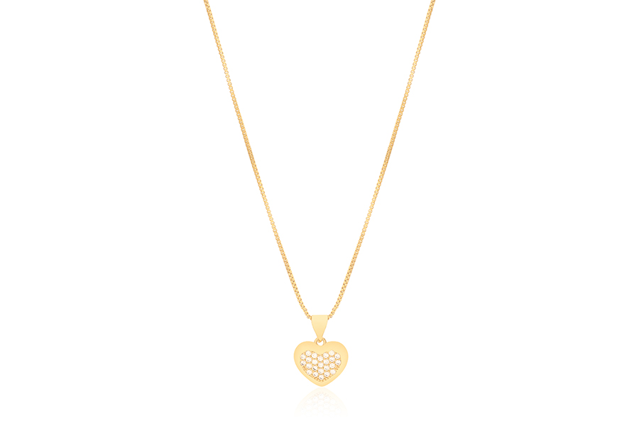 CHOKER BANHADA EM OURO, ELO 1,50mm, 37cm COMPRIMENTO, ZIRCÔNIA 4,50mm E MEDALHA CORAÇÃO 15mm DIÂMETRO