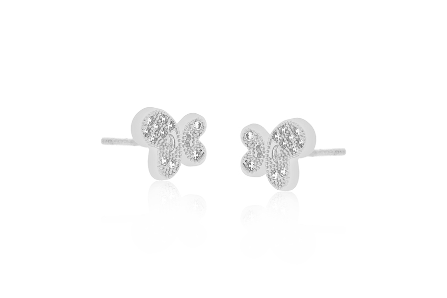 BRINCO EM PRATA, BORBOLETA METADE CRAVEJADA E OUTRA METADE VAZADA, 8mm ALTURA