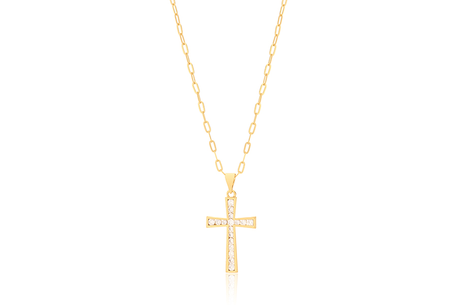 GARGANTILHA BANHADA EM OURO, ELO 1,50mm LARGURA, 60cm COMPRIMENTO E PINGENTE OVAL 18X11mm COM DUAS CRUZES