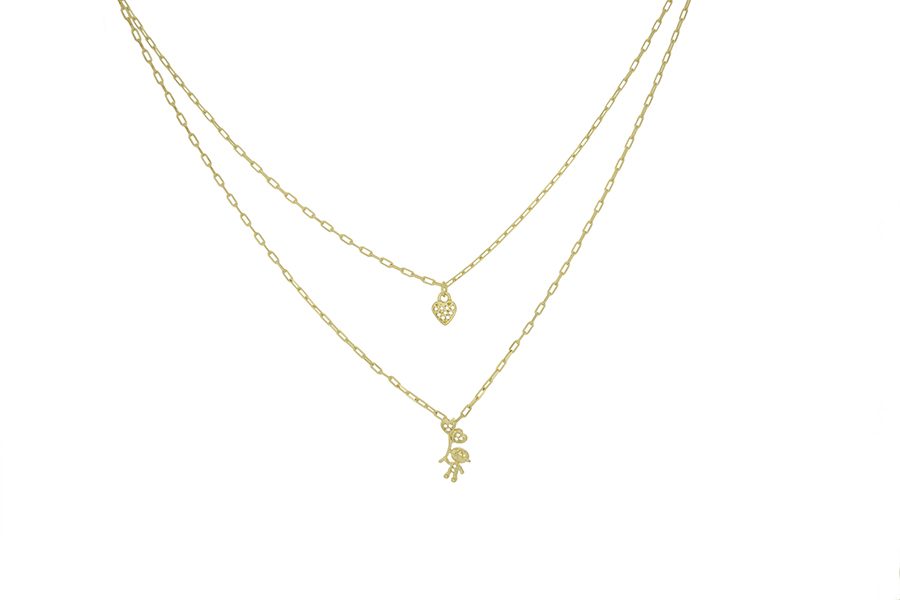GARGANTILHA BANHADA EM PRATA LEVE, DUPLA, ELO 1,50mm ESPESSURA, PONTO DE LUZ 5mm E CORAÇÃO VAZADO 15,50mm LARGURA COM PATA
