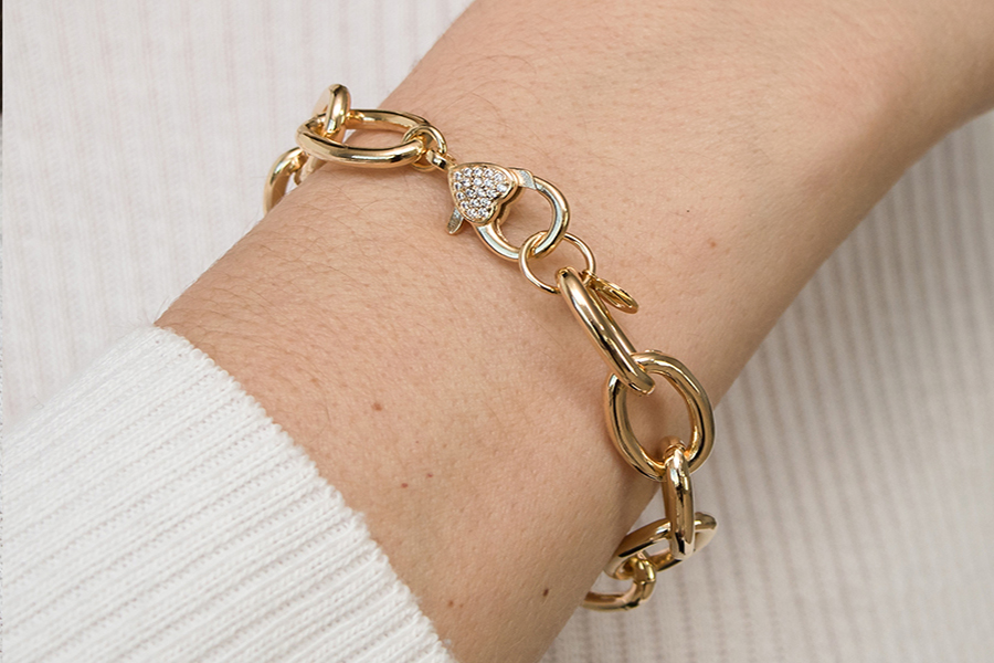 PULSEIRA BANHADA EM OURO, ELO PORTUGUÊS 3mm, ELO CORAÇÃO 4,20mm LARGURA, PINGENTE CORAÇÃO 11mm LARGURA COM MENINO