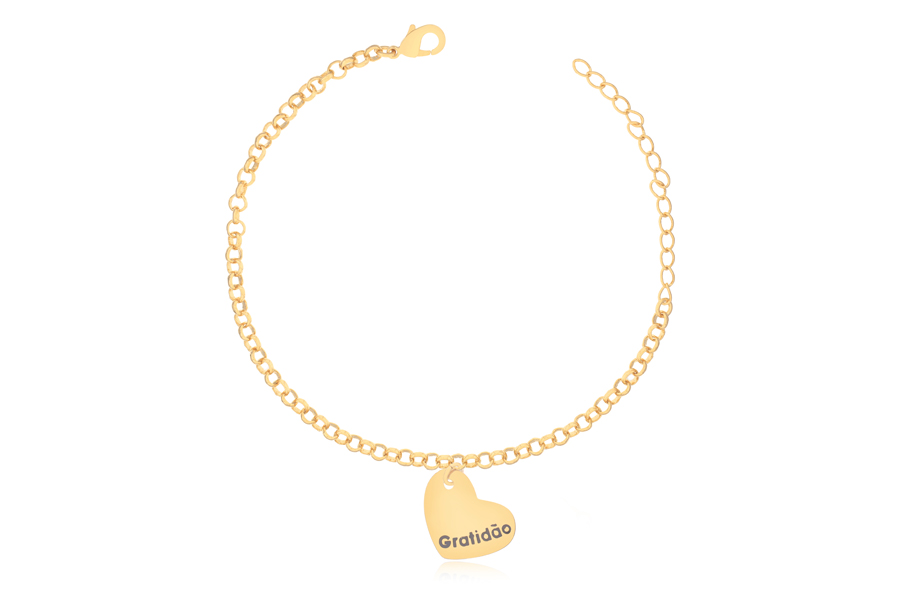 PULSEIRA BANHADA EM OURO, ELO PORTUGUÊS 7mm DIÂMETRO, 2,50mm ESPESSURA E CORAÇÃO 27mm LARGURA, LISO OU ACETINADO