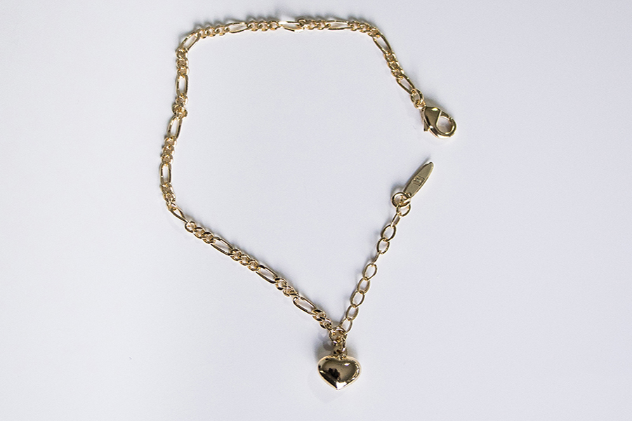 PULSEIRA BANHADA EM OURO, ELO PORTUGUÊS 3mm, ELO CORAÇÃO 4,20mm LARGURA, PINGENTE CORAÇÃO 11mm LARGURA COM MENINO