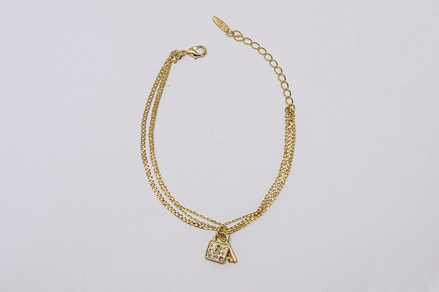 PULSEIRA INFANTIL BANHADA EM OURO, ELO DUPLO 1,80mm E CARTIER 3,50x1,90mm, 15cm COMPRIMENTO, CORAÇÃO, ANJO E CHAVE