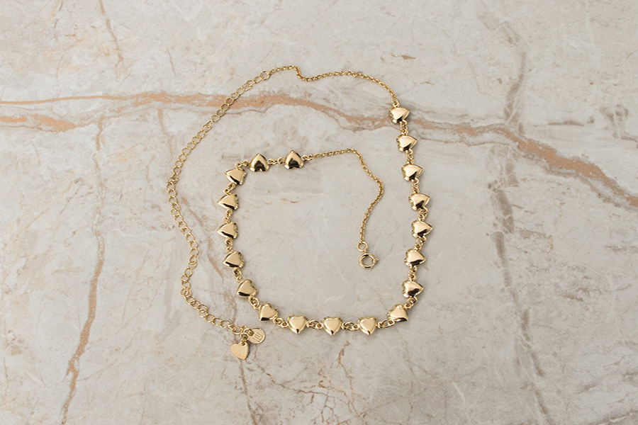 CHOKER BANHADA EM OURO, ELO VENEZIANA 0,80mm, 37cm COMPRIMENTO, EXTENSOR 10cm COMPRIMENTO E 6 CORAÇÕES 6mm ALTURA