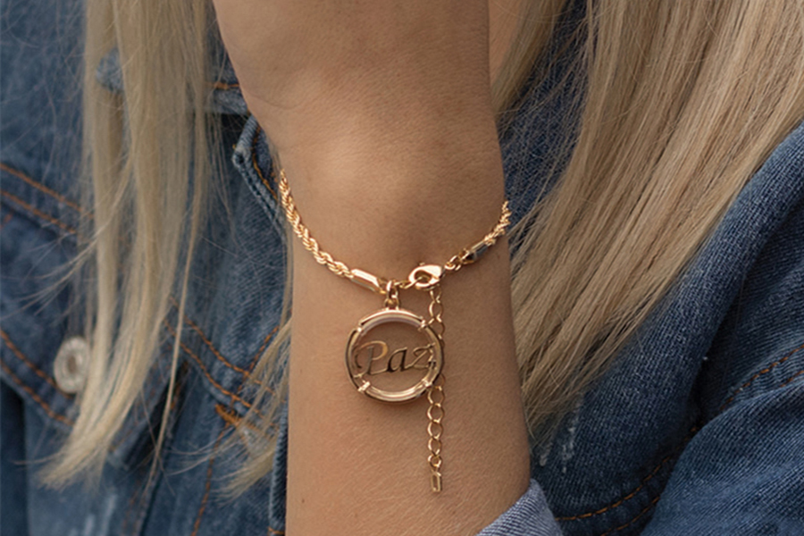 PULSEIRA BANHADA EM OURO, ELO PORTUGUÊS 2,50mm, 16cm COMPRIMENTO, PONTO DE LUZ 4,50mm E PINGENTE PAZ 11mm DIÂMETRO