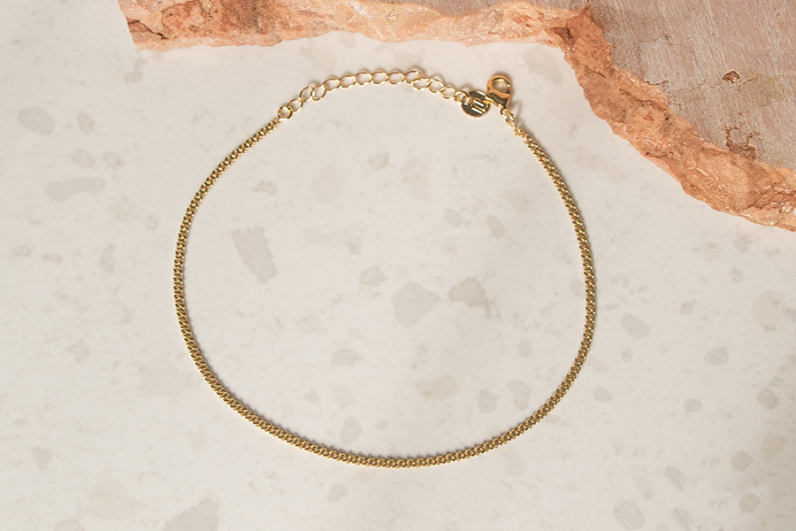 TORNOZELEIRA BANHADA EM OURO, VENEZIANA 1,50mm. 22cm COMPRIMENTO, EXTENSOR 5cm COMPRIMENTO E CORAÇÃO 6,50mm LARGURA