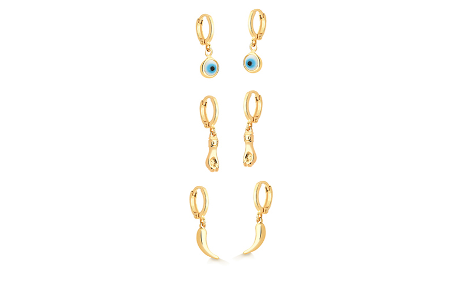 CONJUNTO BANHADO EM OURO, TRIO DE BRINCOS COM PINDURICOS