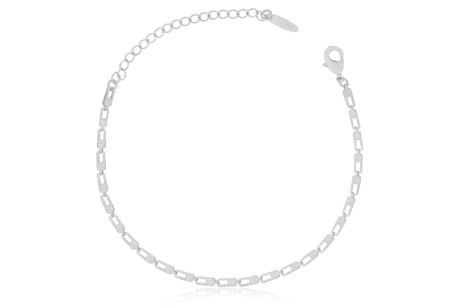 TORNOZELEIRA BANHADA EM RÓDIO BRANCO, ELO 1,50mm LARGURA, OLHO GREGO, 22cm COMPRIMENTO E EXTENSOR 5cm COMPRIMENTO