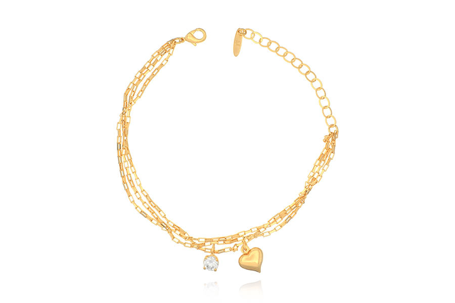 PULSEIRA BANHADA EM OURO, ELO PORTUGUÊS 3mm, ELO CORAÇÃO 4,20mm LARGURA, PINGENTE CORAÇÃO 11mm LARGURA COM MENINA