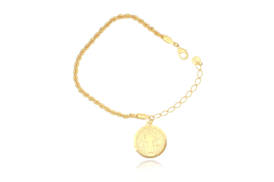 PULSEIRA BANHADA EM OURO, ELO CORDA 4mm, 18cm COMPRIMENTO, EXTENSOR 5cm COMPRIMENTO E SÃO BENTO 30mm DIÂMETRO