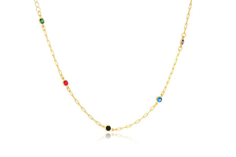 GARGANTILHA BANHADA EM OURO, ELO 1,80mm LARGURA, 40cm COMPRIMENTO E CORAÇÃO 11mm LARGURA COM ZIRCÔNIAS BRANCAS OU COLORIDAS