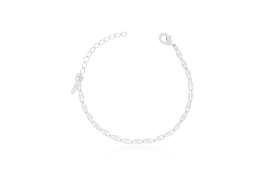 PULSEIRA BANHADA EM RÓDIO BRANCO, CORRENTE ELO 3,30mm ESPESSURA, 18cm COMPRIMENTO, EXTENSOR 5cm COMPRIMENTO E PESO 4,50g