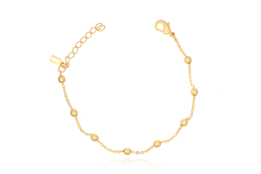 PULSEIRA INFANTIL BANHADA EM OURO, ELO 1,10mm COM BOLINHA, 14cm COMPRIMENTO, PONTO DE LUZ 3,50mm, AMOR DA DINDA 10mm COM CORAÇÃO