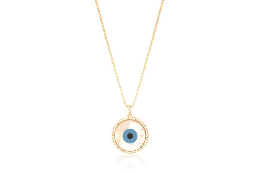 GARGANTILHA BANHADA EM RÓDIO BRANCO, VENEZIANA 0,80mm TRIPLA, CORAÇÃO 8mm LARGURA, OLHO GREGO 4mm E PONTO DE LUZ 3,50mm