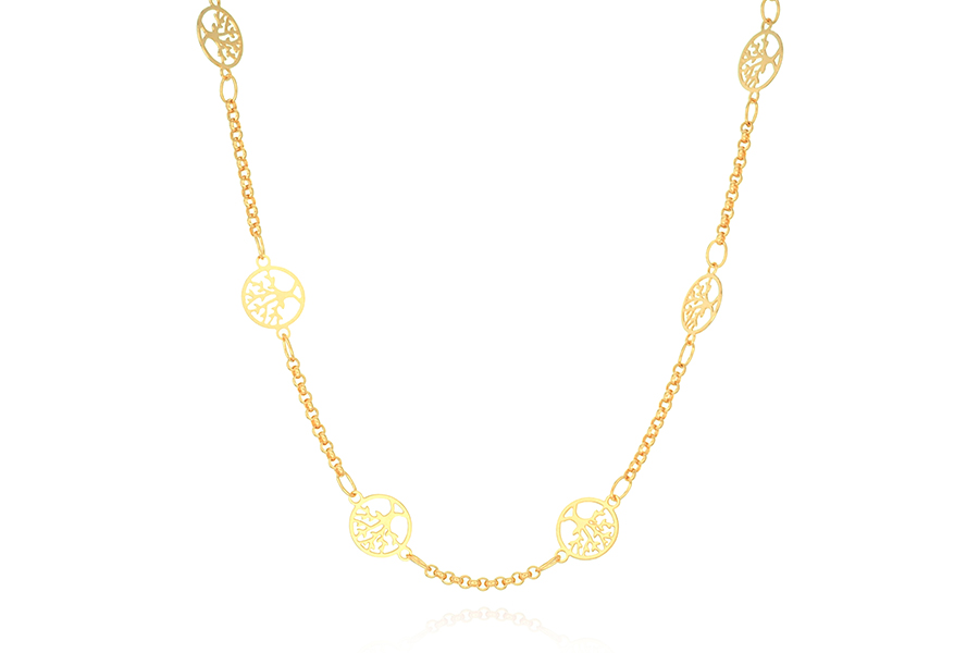 GARGANTILHA BANHADA EM OURO, NOSSA SENHORA DAS GRAÇAS, OVAL 28x23mm, 2 FLORES, ELO VENEZIANA 0,80mm, 45cm COMPRIMENTO, EXTENSOR 5cm