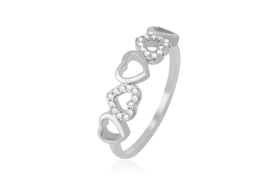 ANEL PRATA LEVE 1 FILEIRA DE ZIRCÔNIAS E LATERAIS COM CORAÇÕES VAZADOS