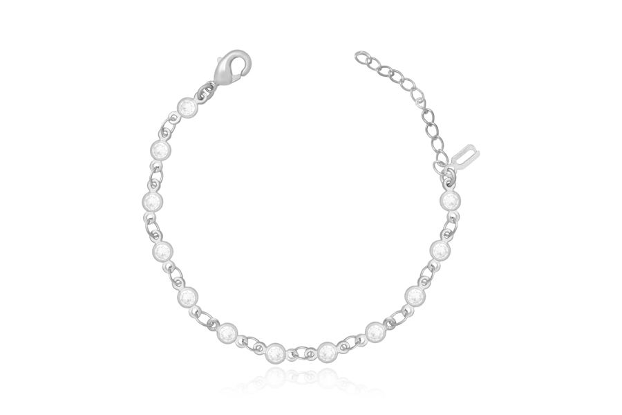 PULSEIRA EM PRATA, INFANTIL, 6 ZIRCÔNIAS REDONDAS COM CRAVAÇÃO INGLESA 5mm DIÂMETRO, ELO PORTUGUÊS, 13+1cm COMPRIMENTO