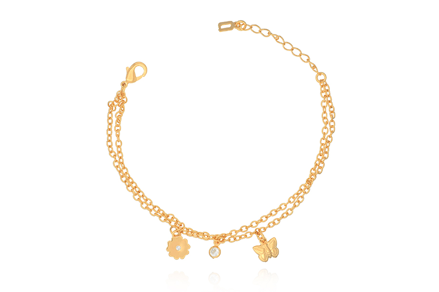 PULSEIRA INFANTIL BANHADA EM OURO, ELO DUPLO 1,80mm E CARTIER 3,50x1,90mm, 15cm COMPRIMENTO, CORAÇÃO, ANJO E CHAVE
