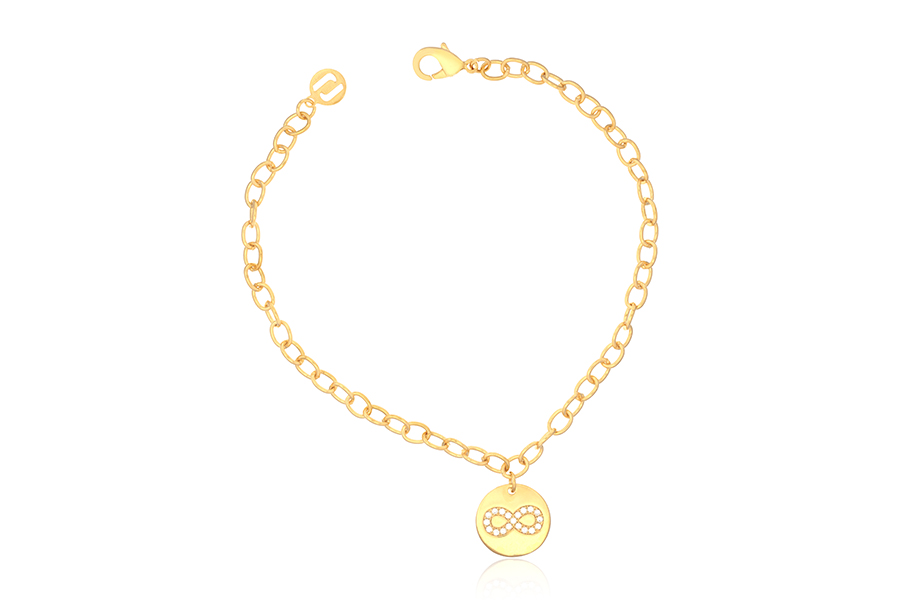 PULSEIRA BANHADA EM OURO, ELO PORTUGUÊS 2,50mm, 16cm COMPRIMENTO, PONTO DE LUZ 4,50mm E PINGENTE PAZ 11mm DIÂMETRO