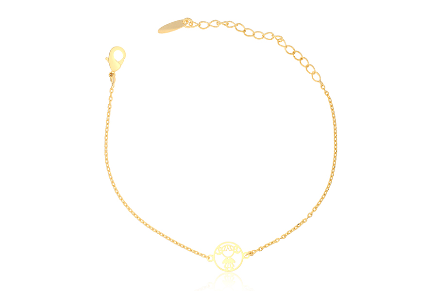 PULSEIRA BANHADA EM OURO, INFANTIL, MELINDROSA, ELO VENEZIANA LONGA 1,50mm ESPESSURA, CHAPINHA COM MENINA 24mm COMPRIMENTO E EXTENSOR 3,50cm COMPRIMENTO