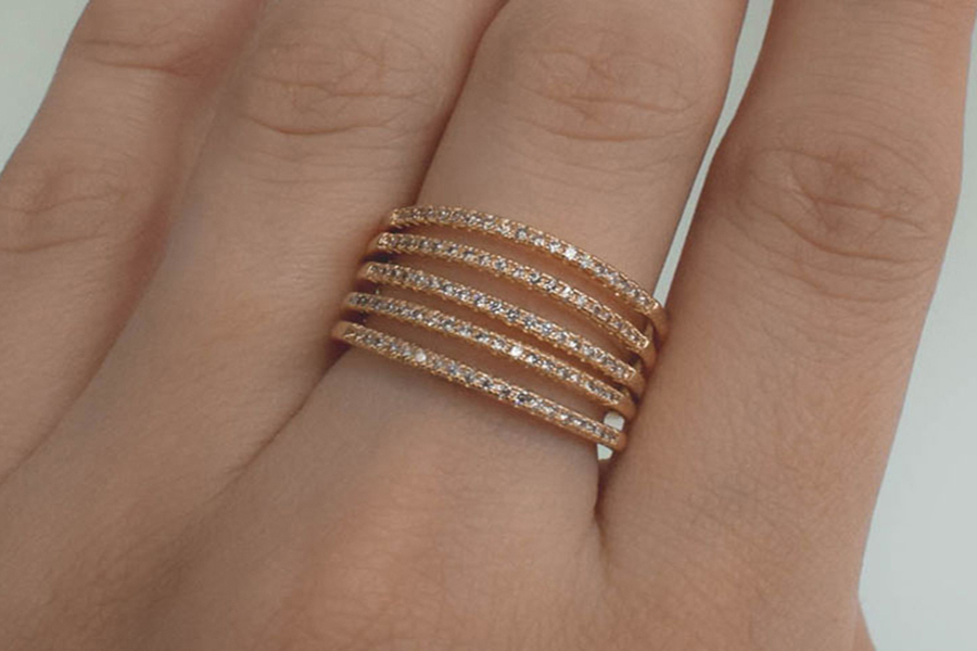 ANEL BANHADO EM OURO, APARADOR DUPLO, COM 2 FILEIRAS DE ZIRCÔNIAS CADA
