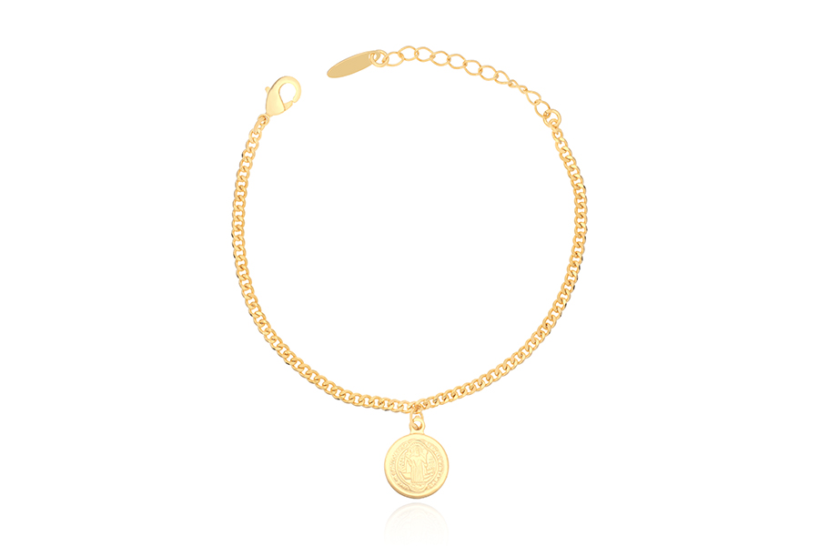 PULSEIRA BANHADA EM OURO, ELO CORDA 4mm, 18cm COMPRIMENTO, EXTENSOR 5cm COMPRIMENTO E SÃO BENTO 30mm DIÂMETRO