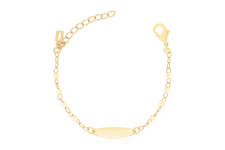 PULSEIRA INFANTIL BANHADA EM OURO, VENEZIANA LONGA 1,50mm ESPESSURA E CHAPINHA COM MENINA 24mm COMPRIMENTO