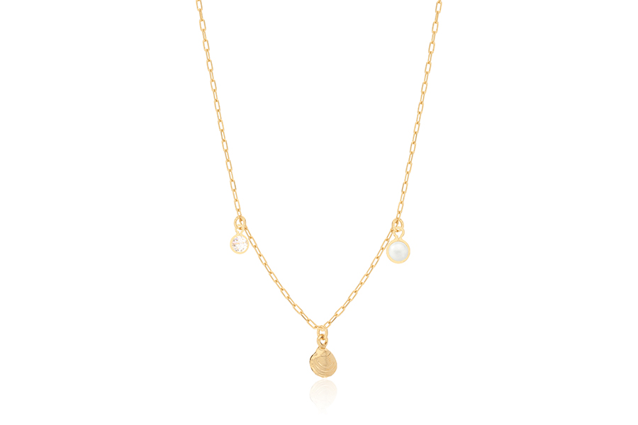 GARGANTILHA BANHADO EM RÓDIO BRANCO, VENEZIANA 0,80mm, 45cm COMPRIMENTO E PÉROLA SHELL PÃO 6 E 10mm, COLEÇÃO ESSÊNCIA