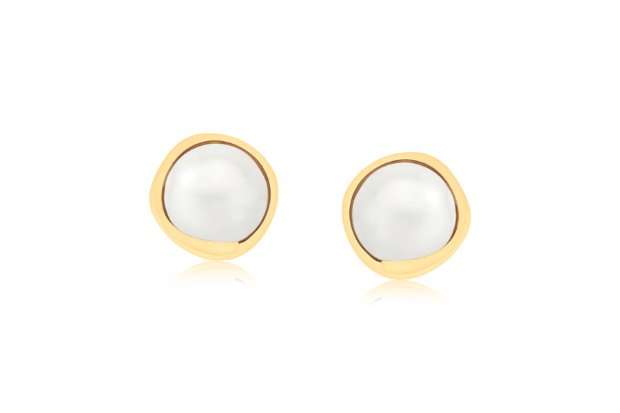 BRINCO BANHADO EM OURO, MEIA ESFERA 13mm DIÂMETRO COM ZIRCÔNIA E MEIA ESFERA LISA