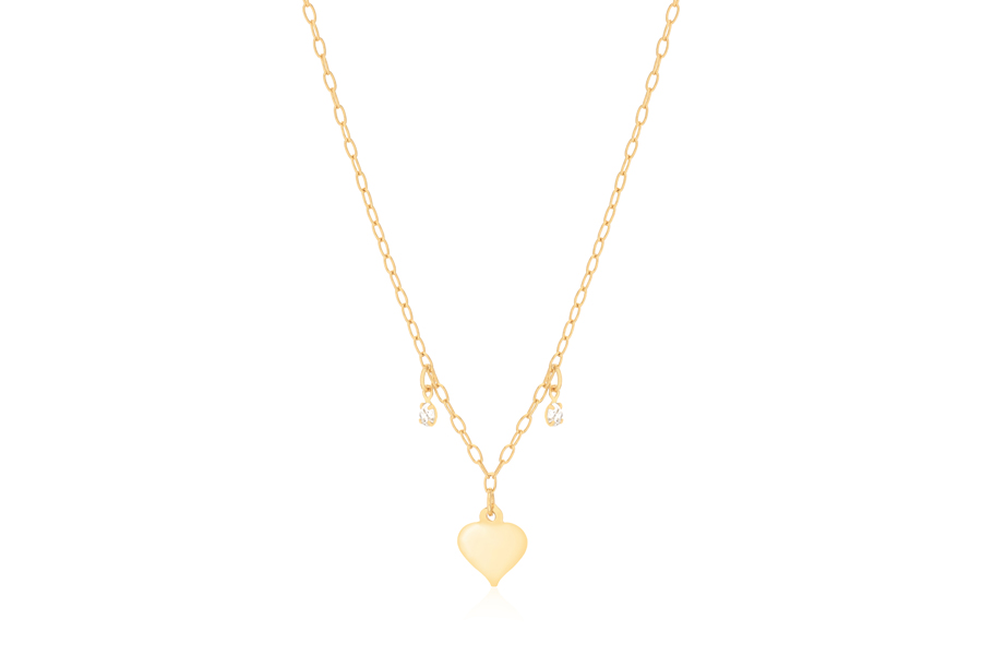 CHOKER BANHADA EM OURO, ELO 1,50mm, 37cm COMPRIMENTO, ZIRCÔNIA 4,50mm E MEDALHA CORAÇÃO 15mm DIÂMETRO