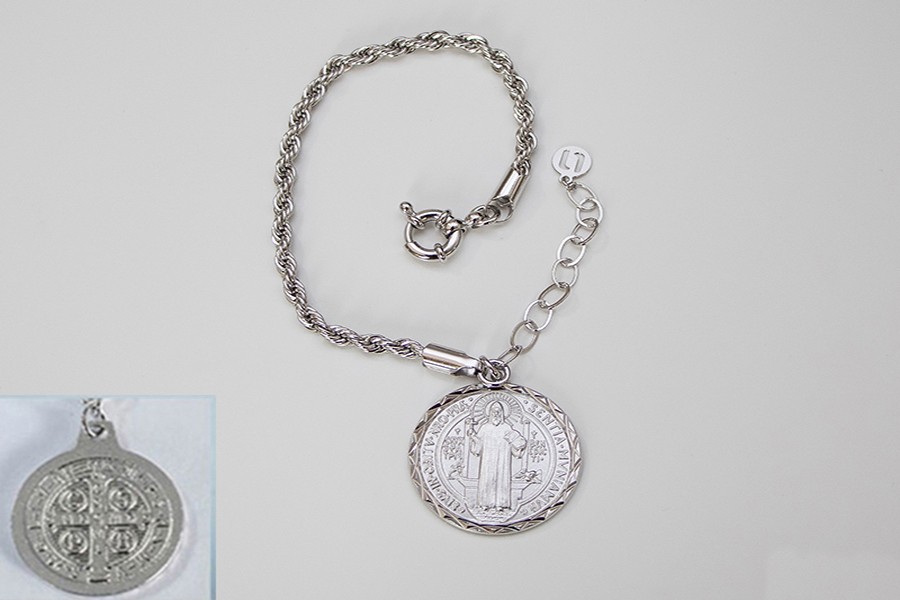 PULSEIRA BANHADA EM RÓDIO BRANCO, ELO PORTUGUÊS 2,50mm, 16cm COMPRIMENTO, E PONTO DE LUZ 4,50mm E PINGENTE FÉ 11mm DIÂMETRO
