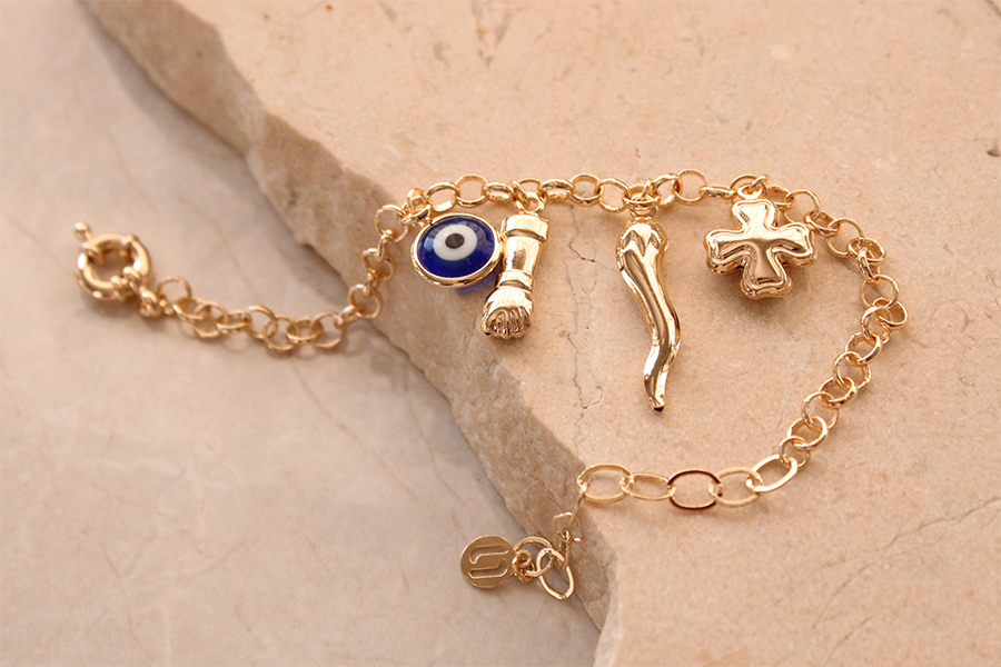 PULSEIRA BANHADA EM RÓDIO BRANCO, ELO 4mm LARGURA, FIGA, CORAÇÃO, CRUZ, OLHO GREGO E PONTO DE LUZ