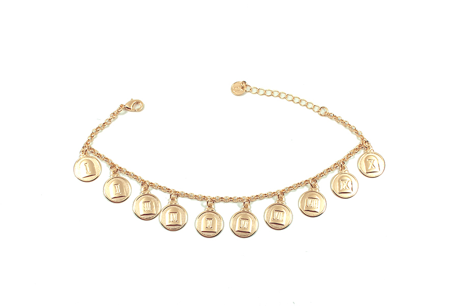 PULSEIRA BANHADA EM OURO, ELO PORTUGUÊS 2,50mm, 16cm COMPRIMENTO, PONTO DE LUZ 4,50mm E PINGENTE PAZ 11mm DIÂMETRO
