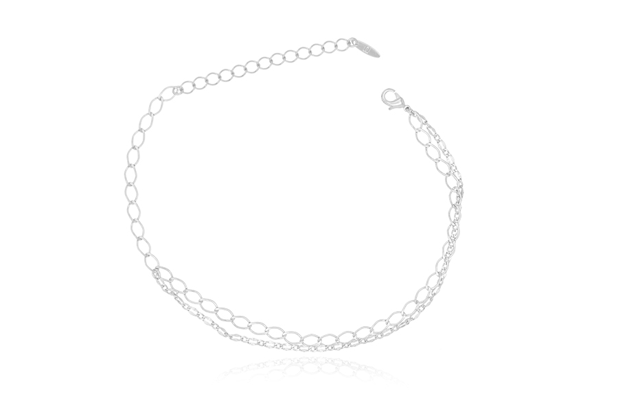 TORNOZELEIRA BANHADA EM RÓDIO BRANCO, CORRENTE ELO CORAÇÃO DUPLO 2,40mm LARGURA, 23cm COMPRIMENTO
