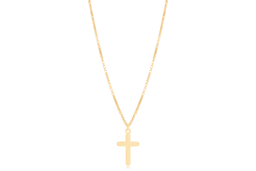 GARGANTILHA BANHADA EM OURO, ELO 1,50mm LARGURA, 60cm COMPRIMENTO E PINGENTE OVAL 18X11mm COM DUAS CRUZES