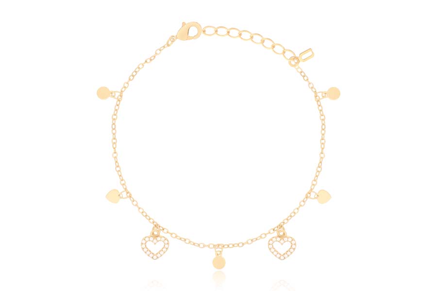 PULSEIRA INFANTIL BANHADA EM OURO, ELO 1,10mm COM BOLINHA, 14cm COMPRIMENTO, PONTO DE LUZ 3,50mm, AMOR DA DINDA 10mm COM CORAÇÃO