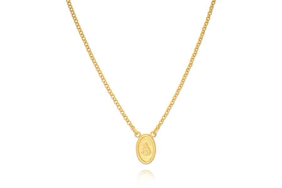 GARGANTILHA BANHADA EM OURO, NOSSA SENHORA DAS GRAÇAS, OVAL 28x23mm, 2 FLORES, ELO VENEZIANA 0,80mm, 45cm COMPRIMENTO, EXTENSOR 5cm