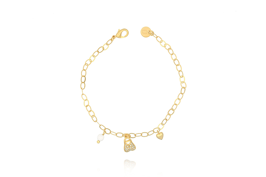 PULSEIRA INFANTIL BANHADA EM OURO, ELO DUPLO 1,80mm E CARTIER 3,50x1,90mm, 15cm COMPRIMENTO, CORAÇÃO, ANJO E CHAVE