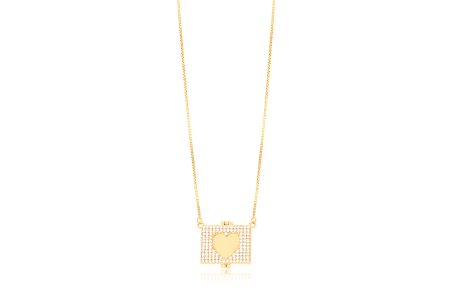 CHOKER BANHADA EM OURO, ELO 1,50mm, 37cm COMPRIMENTO, ZIRCÔNIA 4,50mm E MEDALHA CORAÇÃO 15mm DIÂMETRO