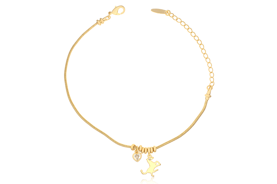 PULSEIRA INFANTIL BANHADA EM OURO, ELO DUPLO 1,80mm E CARTIER 3,50x1,90mm, 15cm COMPRIMENTO, CORAÇÃO, ANJO E CHAVE