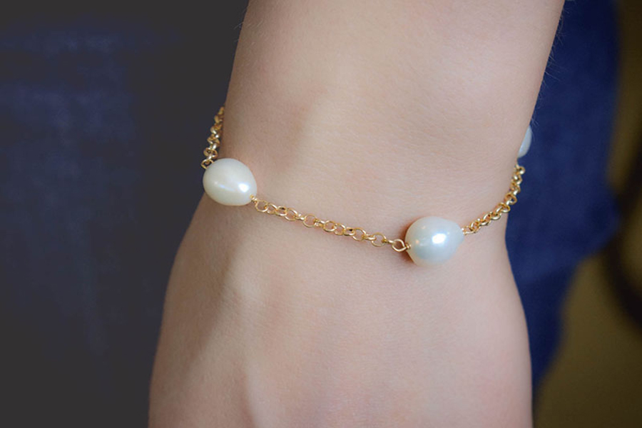 PULSEIRA BANHADO EM OURO, ELO PORTUGUÊS 1,80 E 5mm COM PÉROLAS SHELL 8, 6 E 4mm, 17cm COMPRIMENTO